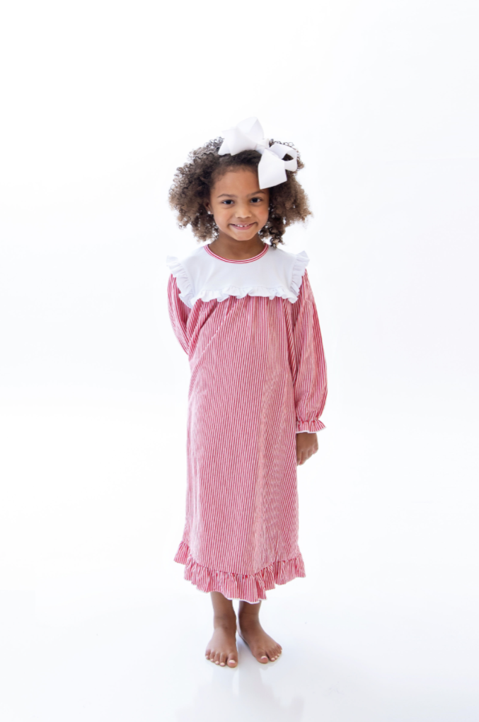 This adorable gown features a soft knit red & white stripe fabric trimmed with white details and lovely ruffles. This is going to look darling on your little girl! Perfect for Christmas photos and Christmas morning! Monogram it for a classic Southern touch!