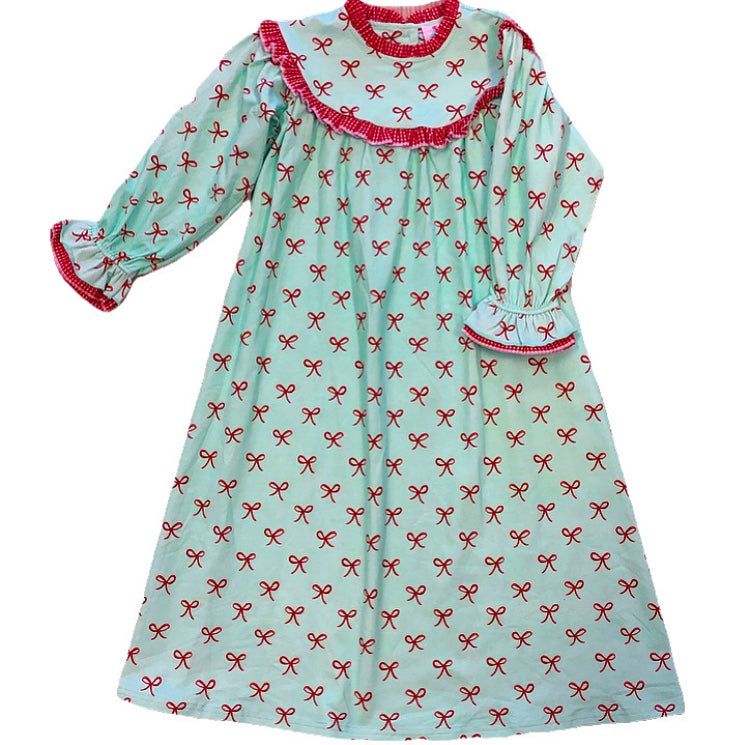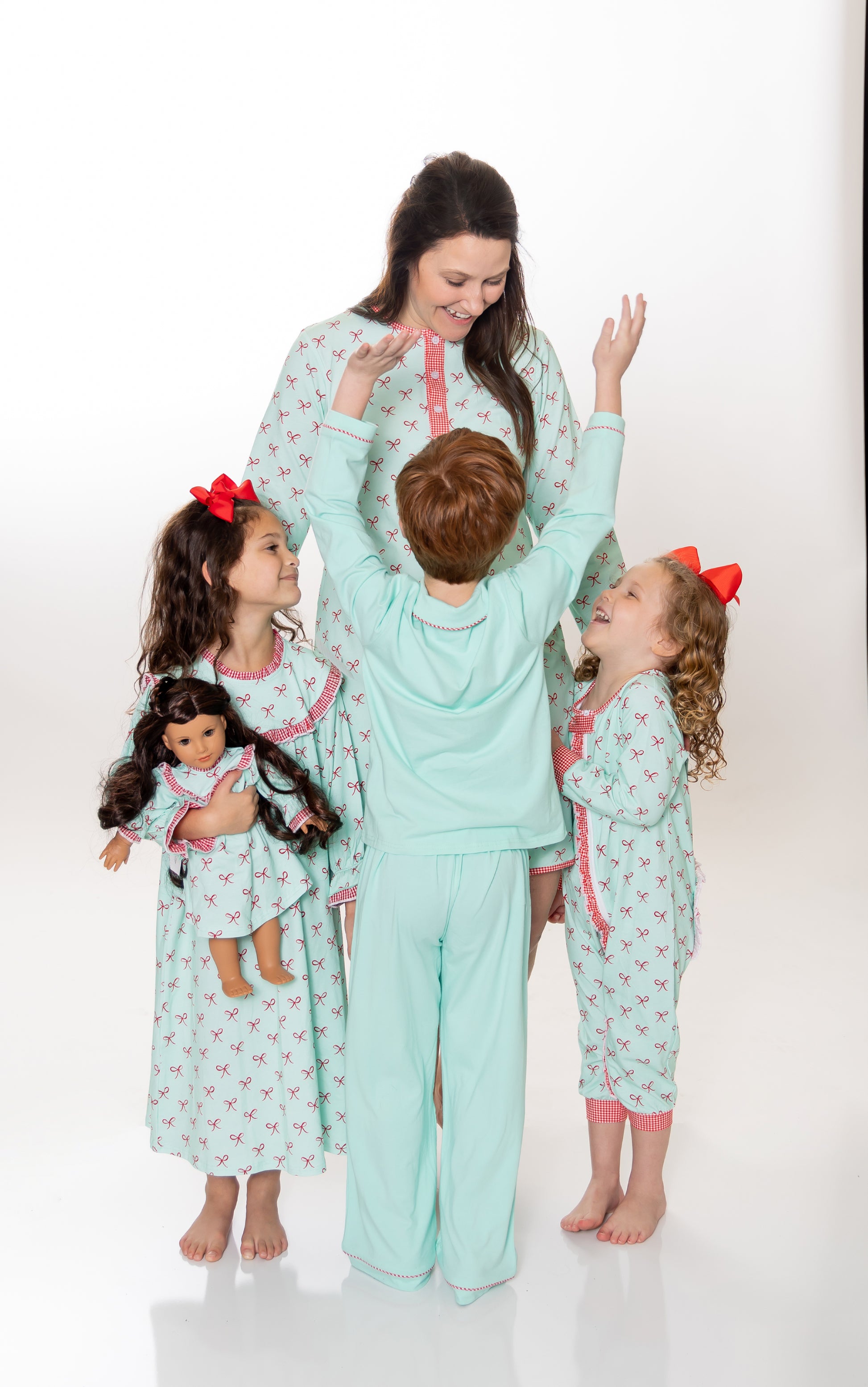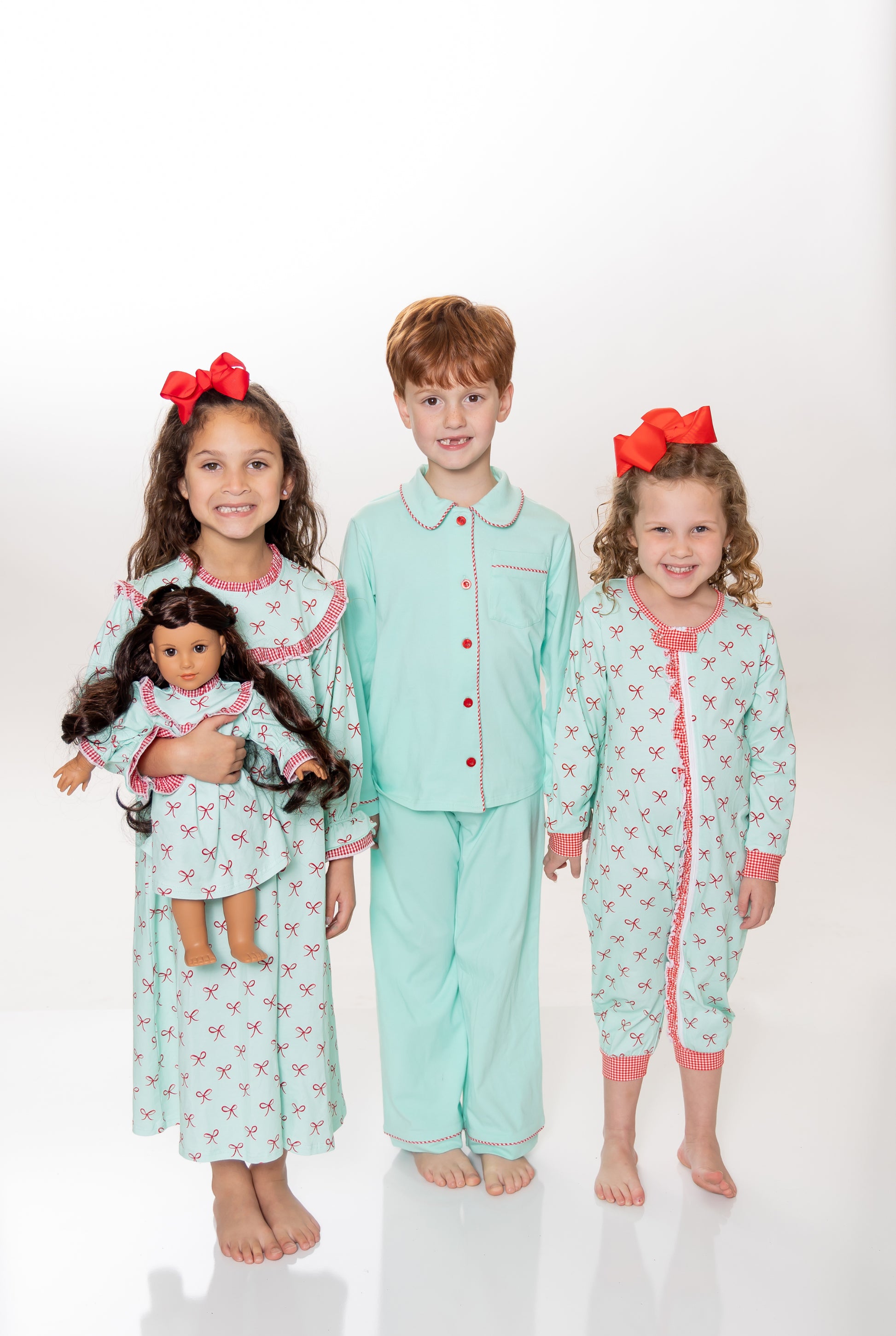 This knit mint Christmas classic is a STUNNER!!! It goes to the calf/ankle depending on the child's height. Make sure you grab the matching doll gown for your cutie on Christmas eve. Unisex mint pjs are also available in kids and adults unisex sizes!
